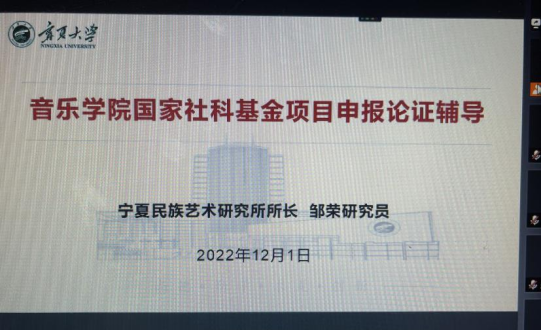 12月1日下午,邹荣研究员对艺术学相关的8个申报书进行了指导,提出逻辑框架、研究范围、概念界定等问题,特别指出不必局限于宁夏地区,建议站在国家层面与角度进行选题。