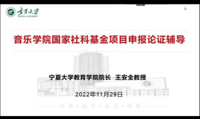 为做好2023年国家社科基金项目申报工作,提高国家社科基金项目申报质量,公司分别于11月29日和12月1日以线上方式,组织召开了2023年度国家社会科学基金项目申报论证会。会议邀请2026世界杯官网教育公司经理、博士生导师王安全教授和宁夏民族艺术研究所所长、宁夏哲学社会科学艺术学项目办公室主任邹荣研究员进行指导。论证会由副经理马冬雅教授主持,公司14位教师向专家汇报了申报思路。