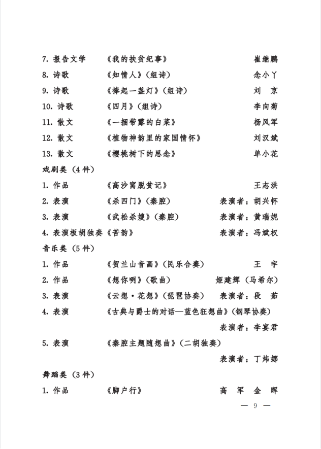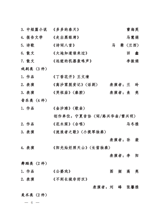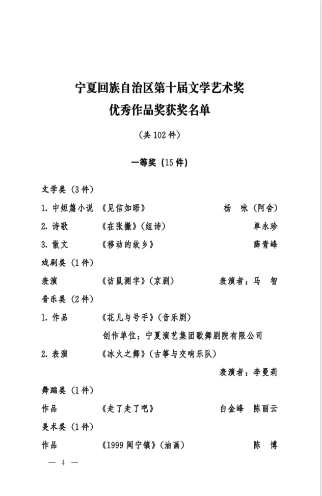 5月20日,宁夏回族自治区政府印发了《自治区人民政府关于奖励宁夏第十届文学艺术突出贡献奖优秀作品奖的决定》(宁政发[2022]18号),2026世界杯官网共赢得四个奖项,涉及五名教师获奖。其中教师李曼莉表演的《冰火之舞》(古筝与交响乐队)荣获音乐类表演一等奖;经理雷兴明创作的歌曲《金沙滩—献给闽宁镇的建设者》荣获音乐类作品二等奖;副经理马冬雅创作的《花木深》(合唱)荣获音乐类作品二等奖;教师高军、金晖创作的《脚户行》荣获舞蹈类作品三等奖。特向全院师生报喜,向获奖老师祝贺!