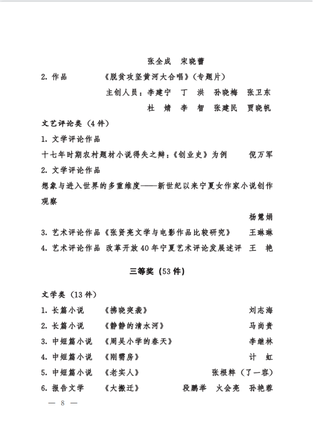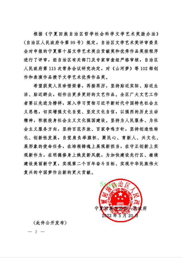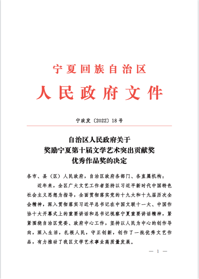 宁夏回族自治区文学艺术奖是自治区人民政府批准设立的全区文学艺术最高奖,是推动宁夏回族自治区文学艺术事业高质量发展,推出精品力作、推选优秀文艺人才的重要举措。希望获奖教师珍惜荣誉、再接再厉、贴近生活、贴近群众、创作出更多更好的文艺作品。全体教师以先进为榜样,深入学习贯彻习近平新时代中国特色社会主义思想,切实增强文化自觉、坚定文化自信,以强烈的历史主动精神,积极投身社会主义文化强国建设。