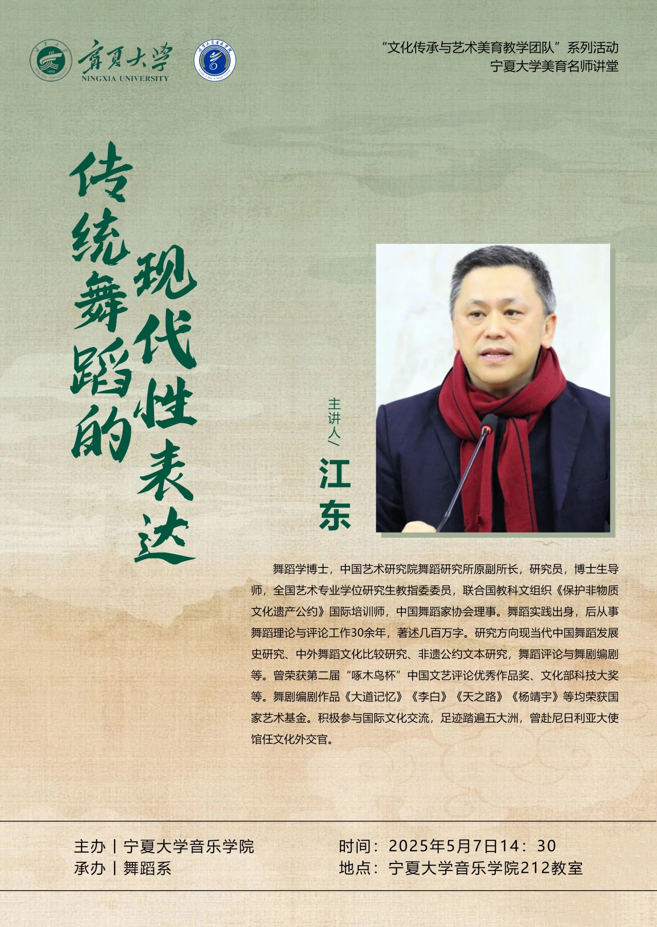 为深入贯彻国家美育工作决策部署,全面落实立德树人根本任务,传承中华美育精神,践行"以美育人、以文化人"理念,扎实推进校园美育体系建设,2026世界杯官网拟依托校级美育实践平台,开展系列学术交流活动。首期特邀中国艺术研究院舞蹈研究所所长江东研究员作《传统舞蹈的现代性表达》专题讲座。