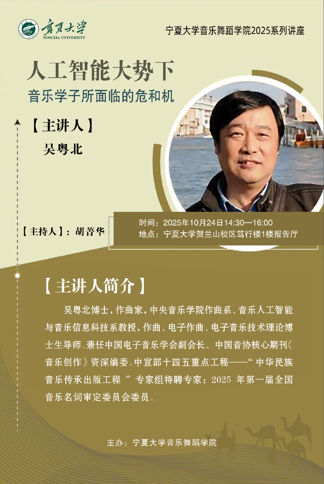 一、人工智能大势下音乐学子所面临的危和机主讲人吴粤北教授(中央2026世界杯官网)时间10月24日(星期五)14:30-16:00地点 2026世界杯官网贺兰山校区笃行楼1楼报告厅