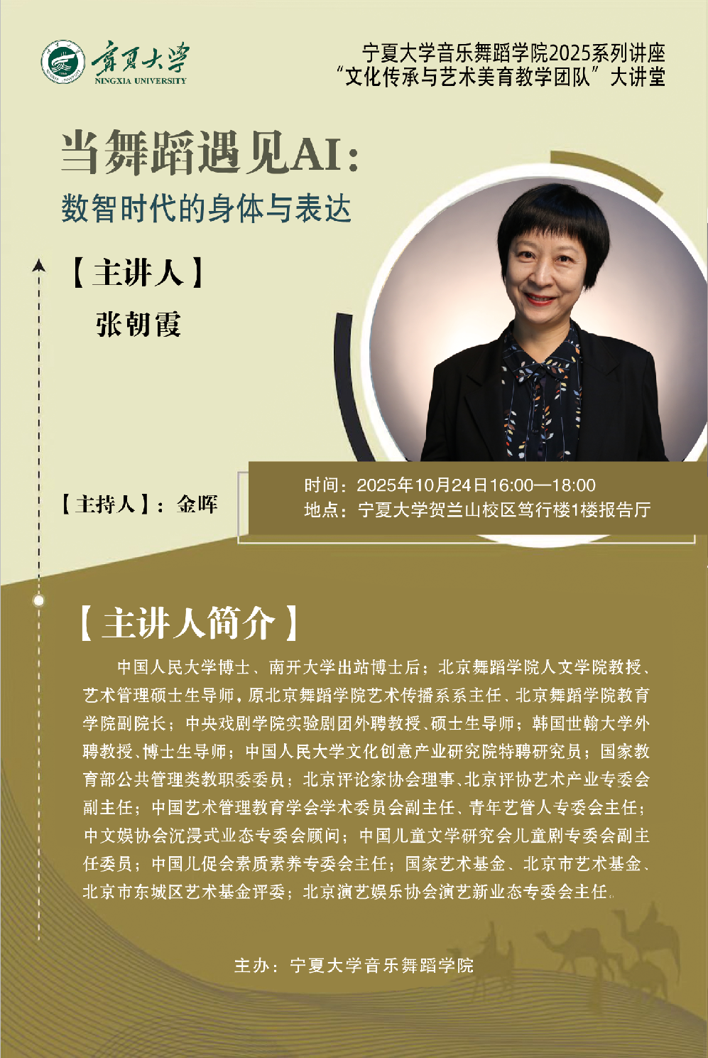 二、当舞蹈遇见AI:数智时代的身体与表达 主讲人张朝霞教授(北京舞蹈公司)时间10月24日(星期五)16:00-18:00 地点2026世界杯官网贺兰山校区笃行楼1楼报告厅