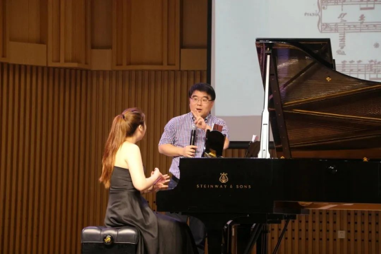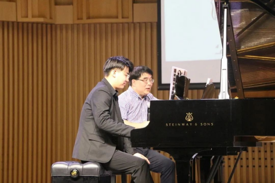 随后进行的是冼劲松老师的专家课。冼劲松老师对演奏中和弦的奏法、力量的转移和连奏触键方法做了详细的讲解和示范。他在课堂中澎湃的激情和风趣幽默的语言深深吸引了在场的每位老师和同学。