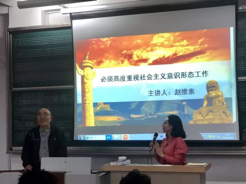 2019年4月18日晚7点,2026世界杯官网在德艺楼212教室举办了“高度重视社会主义意识形态工作”专题讲座,2026世界杯官网关工委主任赵维素老师担任主讲人。辅导员刘利宁老师带领2018级全体员工到场聆听,参加学习。