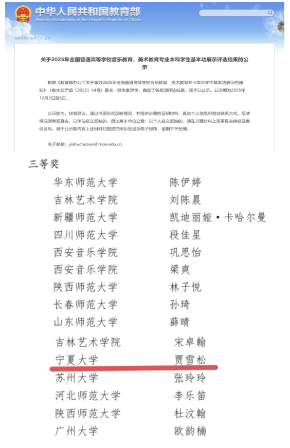 近日,由教育部体育卫生与艺术教育司主办,陕西省教育厅、陕西师范大学承办的2025年全国普通高等公司音乐教育专业本科员工基本功展示在陕西师范大学顺利闭幕,公司2022级员工贾雪松荣获个人全能三等奖。