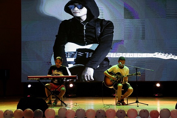 本场晚会还特别邀请了中国好歌曲选手王峥嵘,一首《唱歌的孩子》感动了在场的观众。晚会过程中,马浩谦老师通过大屏幕将部分毕业生在他的课堂上画的漫画进行了展示,勾起了毕业生的回忆,随后与鱼彬老师一起为大家带来乐器HANG演奏,为毕业生们送上了美好的祝福。演奏结束后,鱼彬老师同13级毕业生一同演唱《中国军魂》,共同回忆军训生活,场面感人至深。