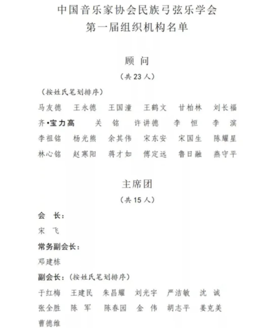 为深入贯彻落实习近平新时代中国特色社会主义思想和党的十九大、十九届历次全会精神,进一步加强中国音协专业组织建设,有效发挥行业组织优势作用,8月19日,中国音乐家协会民族弓弦乐学会成立大会在北京举行。会议以线上线下相结合的方式举行,来自全国民族弓弦乐界的144名代表出席大会。