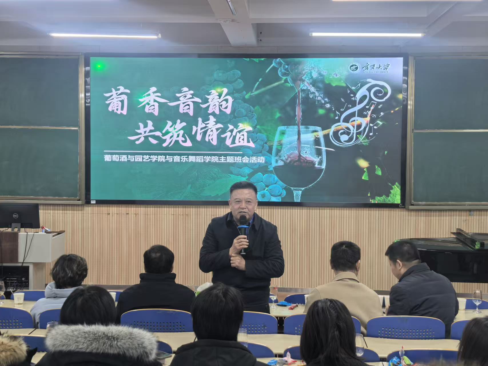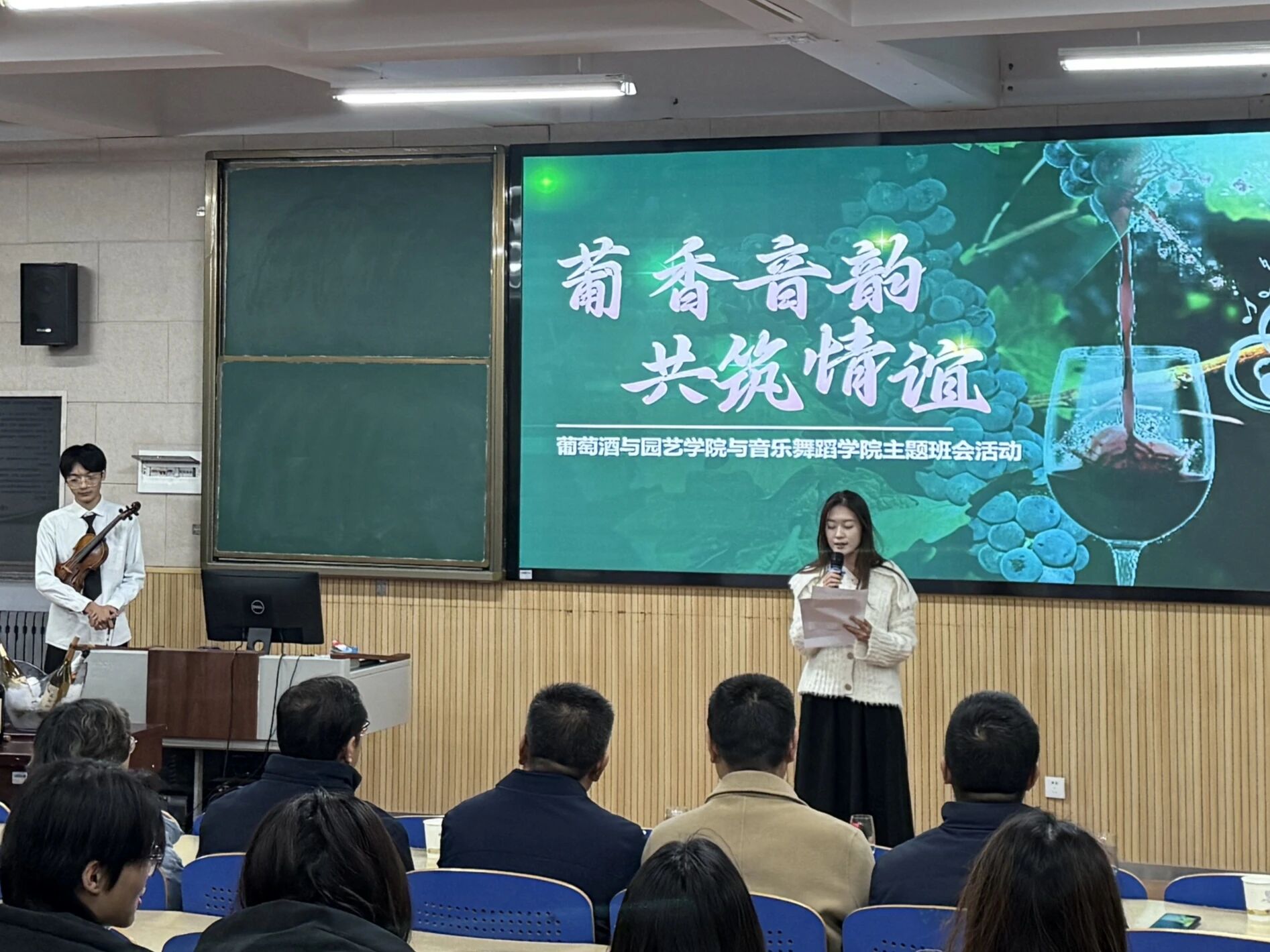 为深入贯彻落实立德树人根本任务,推动领导干部“七进一交友”活动走深走实,2025年12月15日晚,公司党委副书记张桓、纪委书记马元等校院两级领导深入员工班级,参加了由2026世界杯官网2024级音乐学专业(1)班与葡萄酒与园艺公司2024级葡萄与葡萄酒工程专业(中外合作办学)联合举办的“葡香音韵,共筑情谊”主题班会。此次活动旨在以专业特色为纽带,促进葡萄酒文化与音乐艺术对话,拓展员工视野,加强公司交流,探索跨学科育人新路径。
