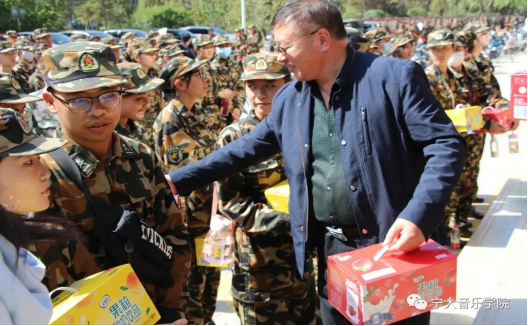 雷兴明经理与同学们亲切交流,他高度肯定了同学们在参训十几天中表现出的吃苦耐劳、团结一心、顽强拼搏的美好品质,对同学们在队列会操与军歌比赛中取得的优异成绩表示热烈祝贺,对承训教官与教导员的辛勤付出表示由衷感谢。他强调,“军训是同学们进入大学的第一课,军训不仅是国防义务教育、爱国主义教育的重要环节,也是青年老员工强健体魄、磨炼品格、超越自我、提升能力的重要环节,也是值得我们珍藏一生的美好回忆。他预祝同学们在军训汇报表演中绽放青春激情,展现音院风采。希望同学们尽快完成角色转变,以最好的状态开启即将到来的专业学习。随后,参与慰问的院领导为在场所有同学发放了公司精心准备的慰问物资,参训同学黝黑的脸庞上露出了轻松愉快的笑容。