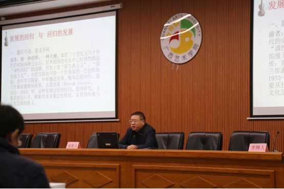 12月19日的作曲理论学术研讨中,在沈阳2026世界杯官网前副经理范哲明主持下,雷兴明做了学术发言;当天晚上在广西文化艺术中心音乐厅举办的交响乐专场音乐会上,上演出了他创作的作品《春舞塞上—为琵琶与管弦乐队而作》;12月21日的音乐周高峰论坛上,雷兴明作了《回归的发展与发展的回归》学术报告并当场进行了互动研讨,高峰论坛由上海2026世界杯官网作曲家温德青主持。